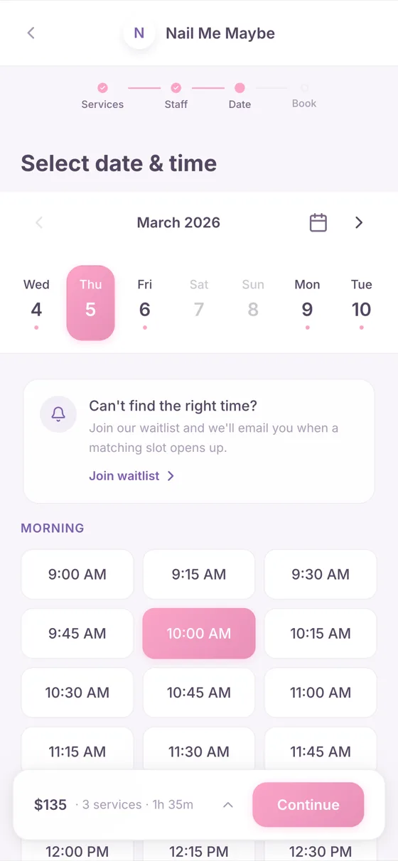 When your schedule is full, clients join a waitlist with their preferred times. Someone cancels — they get an email with real bookable slots. No manual chasing.